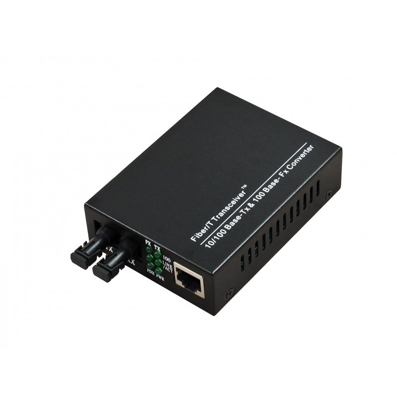 This is a Fast Ethernet 100Base-TX to Fiber 100 Base-FX converter. This model features one fiber port with ST connector. It converts electrical signal from 100Base-TX side into optical signal at 100Base-FX side and vice versa.